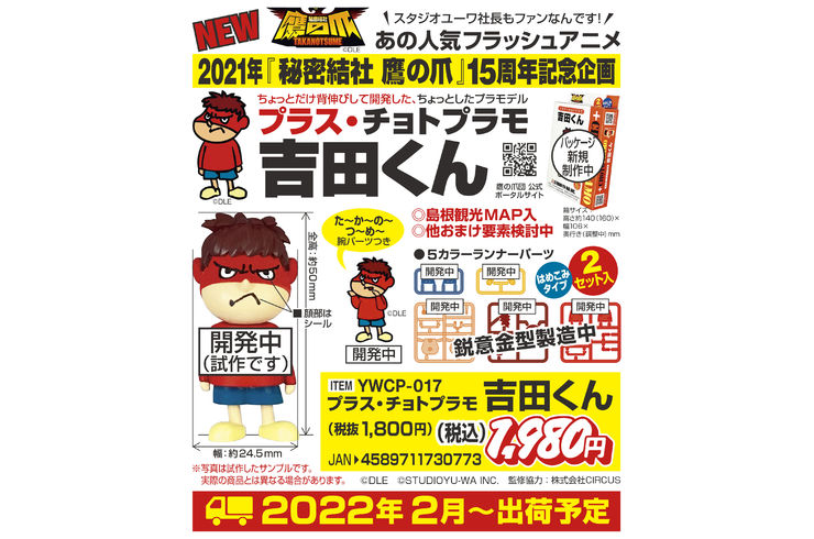 ◎2021年『秘密結社 鷹の爪』15周年記念企画 【2022年2月出荷予定※3月以降発売】あの人気フラッシュアニメ『秘密結社 鷹の爪』の「吉田くん」がチョトプラモになります! ◎成形色:青、黄、うすだいだい、茶、赤 ◎組み立て後の全高:約50mm、組み立て後の幅:約24.5mm ◎た〜か〜の〜つ〜め〜腕パーツつき ◎顔部分はシール ◎島根観光MAP入り ◎他おまけ要素検討中